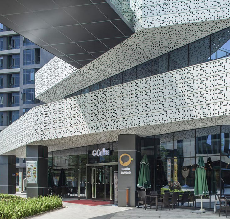 幕墻裝飾配以不同顏色和形狀各異的沖孔鋁單板,增加了時尚與個性元素,營造出獨特的立體效果,富有藝術特色,更會提升建筑的層次感和現代感,沖孔鋁單板顏色按客戶要求進行調配,也可由公司負責提供標準色卡供客戶選擇。