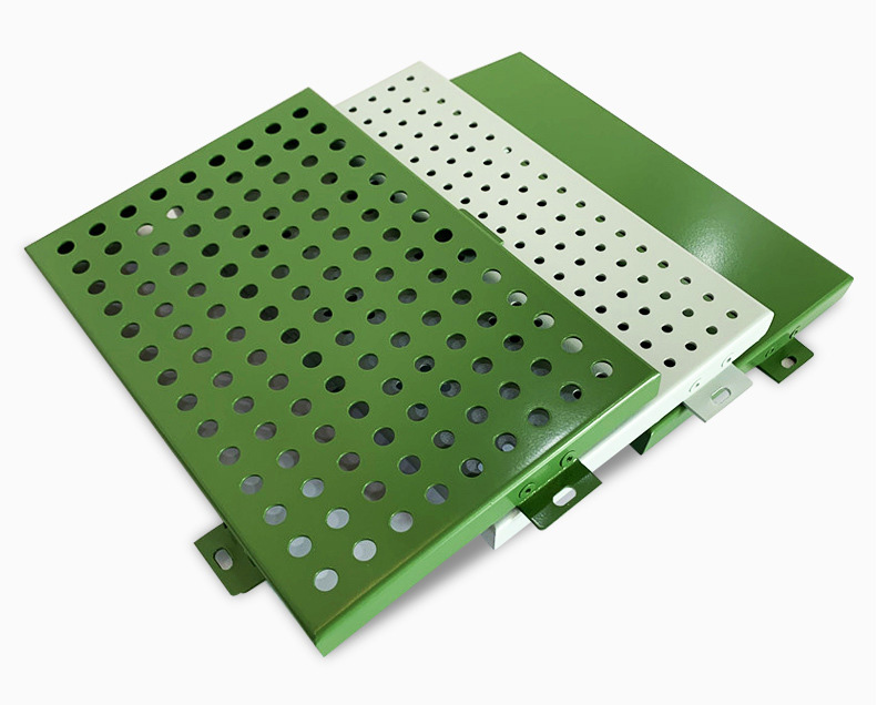沖孔鋁單板一般采用優質1100、3003鋁合金板為基材,再經過數控沖孔、折彎、焊接、打磨等技術加工而成,表面采用氟碳噴涂的一種新型幕墻裝飾材料,氟碳涂料可防火防腐蝕,二十年不變色,現如今大多數的建筑都利用氟碳沖孔鋁單板來做外墻和室內裝飾,該板材耐用時間長,回收率高,完全稱得上是環保綠色建材,非常適合大型建筑物使用。